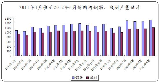 盡管近期國內(nèi)下游需求低迷,鋼廠也不斷曝出利潤低下,但是從下面的產(chǎn)量統(tǒng)計(jì)圖中卻看出,近幾個月不論是線材還是螺紋鋼產(chǎn)量均是歷史高位(據(jù)中華商務(wù)網(wǎng)產(chǎn)量統(tǒng)計(jì)數(shù)據(jù)顯示:2012年6月份全國線材產(chǎn)量1208.8萬噸,同比增長13.5%;鋼筋產(chǎn)量1517.3萬噸,同比增長15.87%。),可見鋼廠的生產(chǎn)積極性并沒有因利潤降低而減弱,這在需求低迷情況下,無疑會激化國內(nèi)建筑鋼材市場供需矛盾,是價(jià)格持續(xù)下滑的一大誘因。