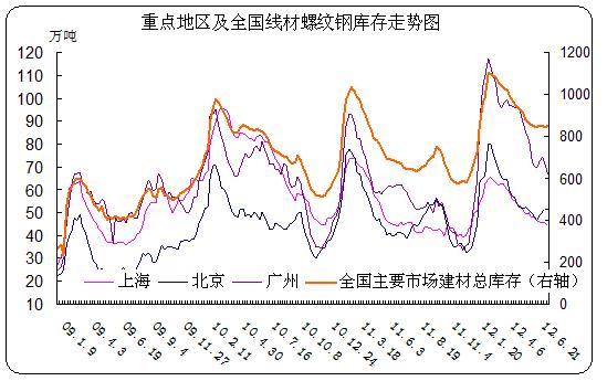 時至盛夏,全國大部分地區(qū)均處在高溫或者陰雨天氣之中,使得工地工程進(jìn)度大幅降低,給原本就疲軟的需求“雪上加霜”,因此雖有個別市場庫存量小幅下降,但整提庫存總量是上升的,從下圖中我們可以清楚看出(據(jù)中華商務(wù)網(wǎng)7月20日庫存統(tǒng)計(jì)數(shù)據(jù)顯示(以下單位均為萬噸),全國主要市場螺紋鋼庫存總量670.78,較去年同期增加138.17;其中北京螺紋鋼庫存45.14,較去年同期增長8.54;上海市場螺紋鋼庫存34.8,較去年同期減少2.51;廣州市場螺紋鋼庫存43.2,較去年同期增加1;。全國主要市場線材庫存177.07,較去年同期增長58.5;其中北京線材庫存6.41,較去年同期增漲2.61;上海線材庫存9.15,較去年同期增長0.44;廣州線材庫存23.3,較去年同期增長8.6)。此外我網(wǎng)了解到不少市場貿(mào)易商由于擔(dān)心后期風(fēng)險(xiǎn)加劇,主動減少與鋼廠訂貨比例,自身庫存量始終都保持著地位運(yùn)行,個別市場庫存量下降與此有很大關(guān)系。這樣需求長期低迷,貿(mào)易商迫于資金、運(yùn)營成本、庫存消化困難等因素影響被迫降價(jià)。