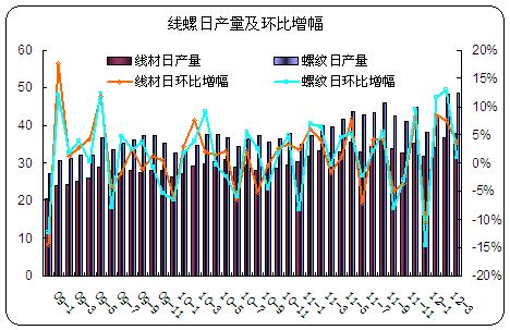 下圖為2009年至2012年全國(guó)粗鋼日均產(chǎn)量及環(huán)比增幅。從圖上看,繼去年11月份全國(guó)粗鋼產(chǎn)量正增長(zhǎng)以外,截至到目前已經(jīng)連續(xù)五個(gè)月呈現(xiàn)環(huán)比上升態(tài)勢(shì),并且四月份日均粗鋼產(chǎn)量已經(jīng)達(dá)到201.9萬(wàn)噸的峰值,遠(yuǎn)遠(yuǎn)超過(guò)了往年。從線材、螺紋鋼產(chǎn)量來(lái)看,4月份也繼續(xù)增長(zhǎng)。其中線材、鋼筋產(chǎn)量分別為1143.2萬(wàn)噸和1461.6萬(wàn)噸,日產(chǎn)量分別為38.1萬(wàn)噸和48.72萬(wàn)噸,環(huán)比上月增幅分別為0.38%和0.89%。雖然本月增幅有所減少,但在基數(shù)較大并且連續(xù)三個(gè)月正增長(zhǎng)的前提下,當(dāng)前線螺產(chǎn)量已經(jīng)遠(yuǎn)遠(yuǎn)超過(guò)了國(guó)內(nèi)需求(國(guó)內(nèi)線材、螺紋鋼出口均很有限)。