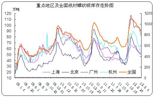 盡管春節(jié)后各地建筑鋼材兩次補(bǔ)庫(kù)以后,隨著今年整個(gè)鋼市的不景氣,中間商和下游拿貨都比較謹(jǐn)慎,社會(huì)庫(kù)存也連續(xù)回落,但回落幅度和速度均有限,以至于截至到五月底,全國(guó)建筑鋼材庫(kù)存以876.62萬(wàn)噸而遠(yuǎn)遠(yuǎn)高于去年同期的711.469萬(wàn)噸,增幅為23.2個(gè)百分點(diǎn)。其中幾個(gè)重點(diǎn)市場(chǎng)方面,除了杭州略低于去年以外,上海、北京、廣州三地線材螺紋鋼庫(kù)存量均以49.31萬(wàn)噸、52.16萬(wàn)噸和85.1萬(wàn)噸而明顯高于去年,尤其是廣州地區(qū),在一季度北方資源大量南下并消化有限的情況下,廣州社會(huì)庫(kù)存一度達(dá)到117.2萬(wàn)噸的峰值,盡管一路下滑,目前85.1萬(wàn)噸較去年同期仍增長(zhǎng)了25.1萬(wàn)噸,增幅為41.8%。