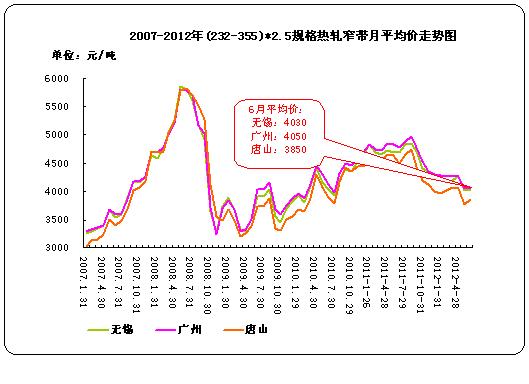 據(jù)中華商務(wù)網(wǎng)監(jiān)測(cè)數(shù)據(jù)顯示,2012年6月,我國(guó)9個(gè)主要市場(chǎng) (232-355) *2.5mm熱軋窄帶月平均價(jià)格為3976元/噸,環(huán)比漲30元/噸,其中唐山、無(wú)錫、廣州三個(gè)主要市場(chǎng)6月份平均價(jià)格為3850元/噸、4030元/噸、4050元/噸,分別比上個(gè)月漲80元/噸,10元/噸, 0元/噸。從上面市場(chǎng)的表現(xiàn),可以看出市場(chǎng)呈現(xiàn)小幅攀升的態(tài)勢(shì)。