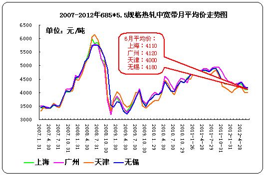 據(jù)中華商務(wù)網(wǎng)監(jiān)測(cè)數(shù)據(jù)顯示,2012年6月我國(guó)11個(gè)主要市場(chǎng)熱軋中寬帶月平均價(jià)格4102元/噸,與上月相比跌30元/噸。其中天津、無(wú)錫、上海、廣州四個(gè)主要市場(chǎng)6月平均價(jià)格分別為4000元/噸、4180元/噸、4110元/噸、4120元/噸,分別較上個(gè)月跌0元/噸, 10元/噸, 30元/噸和110元/噸。從上面多城市對(duì)中寬帶的報(bào)價(jià)不難看出,以廣州為代表的華南地區(qū)中寬帶鋼報(bào)價(jià)較低,其中受低價(jià)資源的沖擊較大。