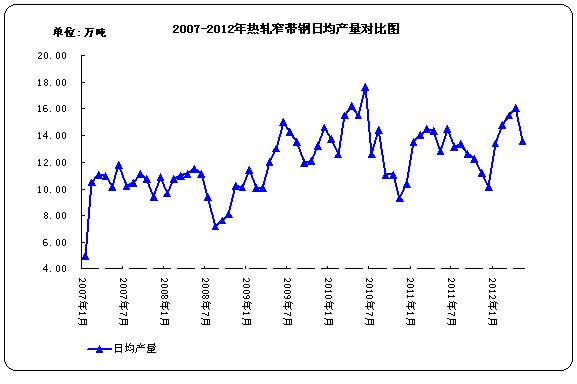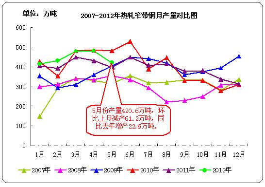 2012年5月份國(guó)內(nèi)熱軋窄帶鋼產(chǎn)量420.6萬(wàn)噸,環(huán)比減產(chǎn)61.2萬(wàn)噸,日均產(chǎn)量13.57萬(wàn)噸,日均環(huán)比減少15.50%;比去年同期產(chǎn)量398萬(wàn)噸增產(chǎn)22.6萬(wàn)噸,同比增長(zhǎng)5.68%。2012年5月我國(guó)冷軋窄帶產(chǎn)量80.3萬(wàn)噸,同比減少9.88%;日均產(chǎn)量2.59萬(wàn)噸,日均環(huán)比減少12.79%。