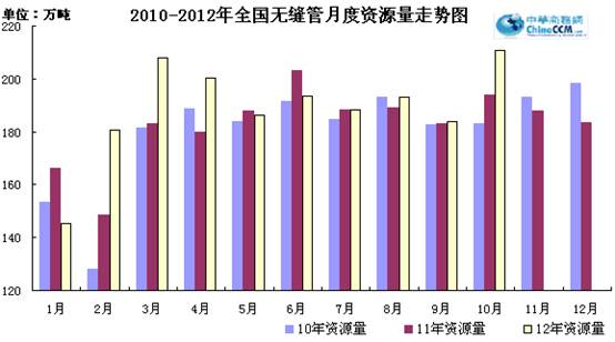 10月份國內(nèi)生產(chǎn)無縫管248萬噸,同比增長8.6%。環(huán)比9月份增產(chǎn)15.6萬噸,環(huán)比增長6.71%。2012年1-10月份累計(jì)生產(chǎn)無縫管2285.9萬噸,同比增長6.9%。