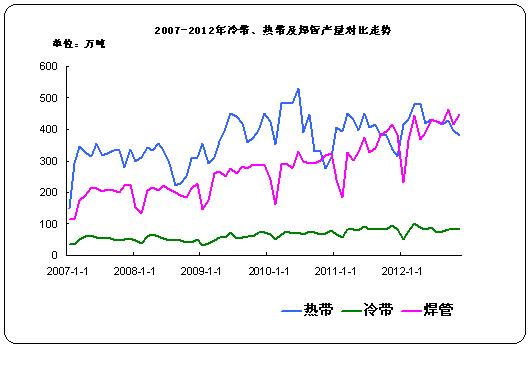 圖3 07-12年冷帶、熱帶及焊管產(chǎn)量走勢對比圖