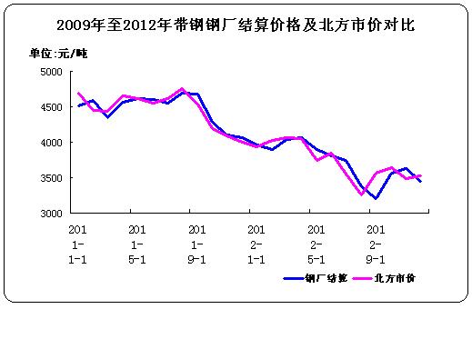 圖5 09-12年帶鋼鋼廠結(jié)算價與北方市價對比