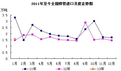 據(jù)國(guó)家統(tǒng)計(jì)局?jǐn)?shù)據(jù)顯示,1月份我國(guó)焊管進(jìn)口量1.54萬(wàn)噸,同比增產(chǎn)0.05萬(wàn)噸,增幅3.68%;環(huán)比增產(chǎn)0.09萬(wàn)噸,增幅5.97%。本月焊管進(jìn)口數(shù)量符合市場(chǎng)預(yù)期,對(duì)國(guó)內(nèi)焊管市場(chǎng)影響不大。(詳見(jiàn)圖二)