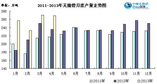 2013年1月到4月無(wú)縫管產(chǎn)量累計(jì)976萬(wàn)噸,比去年同期累計(jì)增加86.2萬(wàn)噸,累計(jì)增長(zhǎng)9.7%。