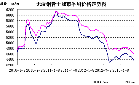 2013年5月28日,通鋼集團磐石鋼管對無縫管出廠價格進行調整:其中冷拔管下調100元/噸,自動軋管機組(Φ76-108)下調120元/噸,熱軋機組(Φ76-180)下調50元/噸,合金管下調100元/噸,其中20#Φ108*4.5熱軋管掛牌價格4530元/噸。(以上政策為出廠含稅價格,自2013年5月28日起執(zhí)行。)