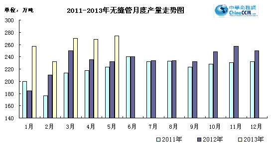 2013年1月到5月無縫管產(chǎn)量累計1250萬噸,比去年同期累計增加103.1萬噸,累計增長9%。