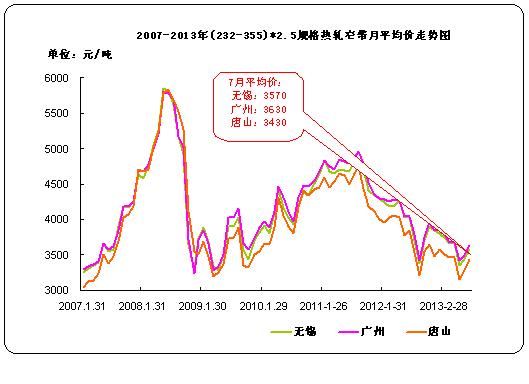 據(jù)中華商務(wù)網(wǎng)監(jiān)測(cè)數(shù)據(jù)顯示,2013年7月我國(guó)11個(gè)主要市場(chǎng)熱軋中寬帶月平均價(jià)格3586元/噸,與上月相比漲106元。其中天津、無(wú)錫、廣州四個(gè)主要市場(chǎng)7月平均價(jià)格分別為3520元/噸、3560元/噸、3680元/噸,分別較上個(gè)月漲140元/噸,漲60元/噸,漲120元/噸。