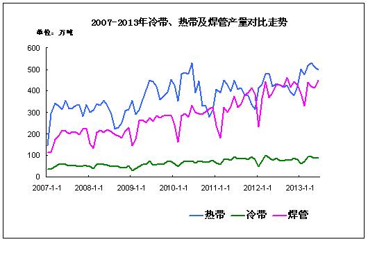 據(jù)中華商務(wù)網(wǎng)監(jiān)測(cè)數(shù)據(jù)顯示,2013年6月份國(guó)內(nèi)熱軋窄帶鋼產(chǎn)量498.8萬(wàn)噸,環(huán)比減產(chǎn)11.5萬(wàn)噸,環(huán)比減少2.25%;日均產(chǎn)量16.63萬(wàn)噸,日均環(huán)比減少2.23%;比去年同期產(chǎn)量433.3萬(wàn)噸增產(chǎn)65.5萬(wàn)噸,同比增長(zhǎng)15.12%。2013年6月份國(guó)內(nèi)冷軋窄帶鋼產(chǎn)量89.9萬(wàn)噸,環(huán)比增產(chǎn)3.1萬(wàn)噸。