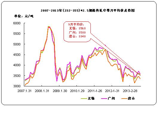 據(jù)中華商務(wù)網(wǎng)監(jiān)測數(shù)據(jù)顯示,2013年9月,我國9個主要市場 (232-355) *2.5mm熱軋窄帶月平均價格為3493元/噸,環(huán)比跌110元/噸,其中唐山、無錫、廣州三個主要市場9月份平均價格為3340元/噸、3560元/噸、3580元/噸,分別比上個月跌130元/噸,跌60元/噸,跌140元/噸。