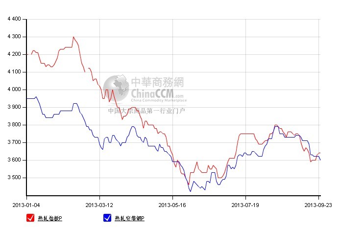 據(jù)中華商務(wù)網(wǎng)監(jiān)測數(shù)據(jù)顯示,2013年9月我國11個主要市場熱軋中寬帶月平均價格3553元/噸,與上月相比跌103元。其中天津、無錫、廣州四個主要市場9月平均價格分別為3480元/噸、3550元/噸、3630元/噸,分別較上個月跌100元/噸,跌80元/噸,跌130元/噸。
