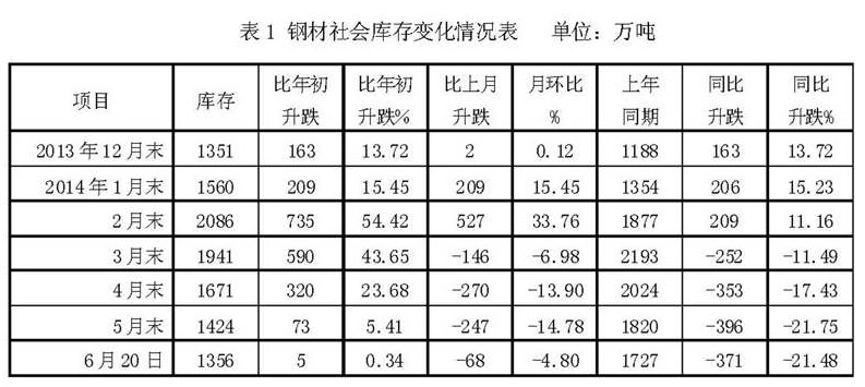 5月末,全國(guó)主要市場(chǎng)5種主要鋼材社會(huì)庫(kù)存量降至1424萬(wàn)噸,比4月末下降247萬(wàn)噸,降幅為14.78%,連續(xù)第3個(gè)月下降;與去年同期相比,下降396萬(wàn)噸,降幅為21.75%;與今年初相比,上升73萬(wàn)噸,升幅為5.41%。自今年2月末以來(lái),鋼材社會(huì)庫(kù)存持續(xù)下降。截至6月20日,鋼材社會(huì)庫(kù)存水平進(jìn)一步降至1356萬(wàn)噸,與2月末的峰值相比,已累計(jì)下降730萬(wàn)噸,降幅達(dá)到34.99%。(見(jiàn)表1)鋼材庫(kù)存持續(xù)回落,顯示出市場(chǎng)對(duì)后市信心不足。