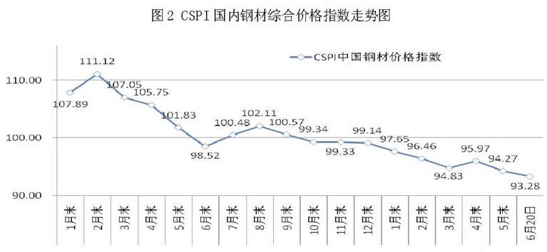 今年初以來(lái),國(guó)內(nèi)市場(chǎng)鋼材價(jià)格總體呈現(xiàn)下行走勢(shì)。如果剔除4月份的小幅回升,鋼價(jià)基本上是從去年的9月份起就處于持續(xù)下行的態(tài)勢(shì),到今年6月份已連續(xù)第9個(gè)月在100點(diǎn)以下。截至6月20日,中國(guó)鋼鐵工業(yè)協(xié)會(huì)CSPI鋼材綜合價(jià)格指數(shù)跌至93.28點(diǎn),是2006年2月份以來(lái)的最低水平。
