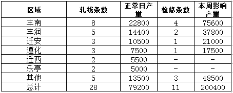 中商網(wǎng)訊:本周唐山20家232系列帶鋼廠28條帶鋼生產線中,11條帶鋼線檢修或停產,影響產量20.04萬噸,產能利用率為63.85%,較上周上漲3.15%,17條帶鋼線開工生產,開工率60.71%,較上周持平。