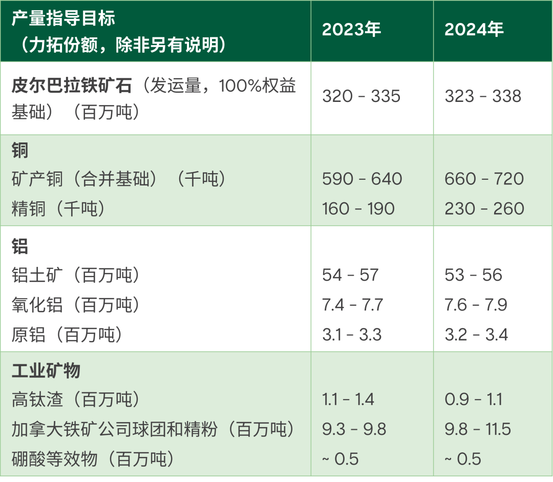 力拓還發(fā)布了2024年的產(chǎn)量指導目標,皮爾巴拉鐵礦石的發(fā)運量(100%權益基礎)與10月現(xiàn)場考察時公布的結果保持一致,將在3.23-3.38億噸之間。