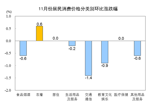 11月份,全國居民消費價格環(huán)比下降0.5%。其中,城市下降0.5%,農(nóng)村下降0.4%;食品價格下降0.9%,非食品價格下降0.4%;消費品價格下降0.5%,服務價格下降0.4%。