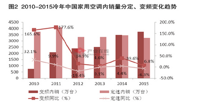 根據(jù)相關(guān)數(shù)據(jù)監(jiān)測(cè)顯示,2010-2015冷年變頻空調(diào)內(nèi)銷量呈逐年遞增的趨勢(shì),變頻空調(diào)在內(nèi)銷中的結(jié)構(gòu)占比也在逐年加大。從成長性來看,2010-2015冷年5年間,變頻空調(diào)內(nèi)銷量以37.8%的年均復(fù)合增長率復(fù)合增長;從目前所處的地位來看,2015冷年,變頻空調(diào)在家用空調(diào)總內(nèi)銷中的占比結(jié)構(gòu)達(dá)到53.6%,較去年同期增長3.3個(gè)百分點(diǎn)。但不能否認(rèn)的是,國內(nèi)的變頻市場(chǎng)已經(jīng)到了相對(duì)均衡的發(fā)展?fàn)顟B(tài),未來變頻趨勢(shì)發(fā)展也將進(jìn)入新常態(tài),平穩(wěn)緩慢增長。2010-2015冷年變頻空調(diào)和定速空調(diào)內(nèi)銷量變化趨勢(shì)如圖2所示。