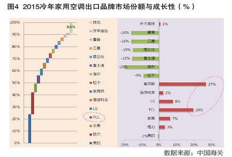 最“亮眼”出彩:TCL。在全球經(jīng)濟(jì)低迷形勢(shì)下,國內(nèi)三巨頭之一海爾出口下滑近兩成,穩(wěn)居出口份額第一的美的也小幅下滑;但反觀二線品牌,TCL、奧克斯的表現(xiàn)讓人眼前一亮,兩者同比增長二成以上,其中TCL出口規(guī)模排至前四(圖4),表現(xiàn)更出彩。