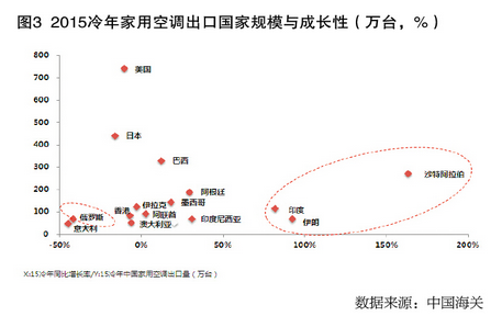 最“火熱”強(qiáng)勁:沙特阿拉伯、印度、伊朗。2015冷年成長性最快的三個(gè)國家分別為沙特阿拉伯、印度和伊朗(圖3)。三個(gè)國家均位居在亞洲和中東地區(qū),沙特阿拉伯因?yàn)槟苄?biāo)準(zhǔn)的適應(yīng)和酷熱天氣延續(xù)了一直以來的強(qiáng)勁增長,冷年同比幾乎翻兩番。伊朗同比增長92%,隨著近期離奇高溫和伊朗核協(xié)議問題的解決出現(xiàn)曙光,伊朗市場(chǎng)還有望繼續(xù)發(fā)力。印度空調(diào)高度依賴于進(jìn)口,雖然過去一年中印度盧比貶值,使進(jìn)口更加昂貴;但因厄爾尼諾現(xiàn)象帶來的極端天氣,還是帶動(dòng)了空調(diào)市場(chǎng),中國家用空調(diào)對(duì)印度的出貨量不斷增加,但需注意的是,這種不確定的天氣也導(dǎo)致了6月底庫存堆積,但印度不論是經(jīng)濟(jì)還是人口都在快速增長,市場(chǎng)仍擁有巨大潛力。
