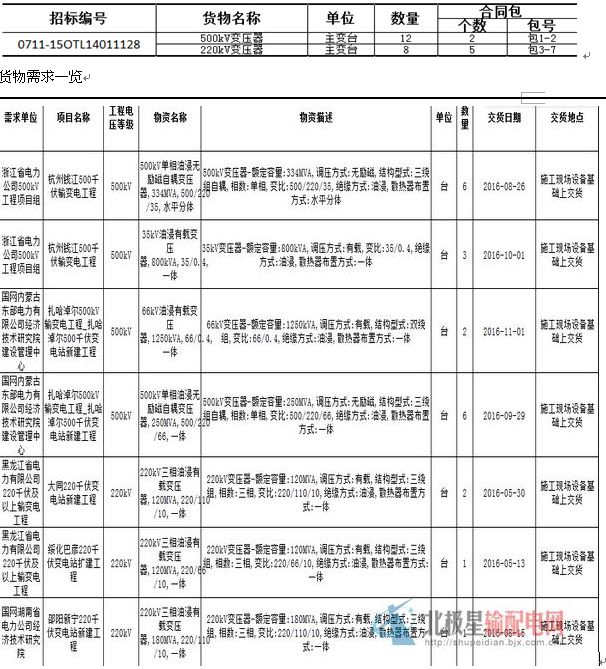 國網(wǎng)變電項目2015年(新增批次 220~500kV變壓器)貨物集中招標