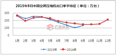 據(jù)最新監(jiān)測數(shù)據(jù)顯示,2015年9月我國空調(diào)壓縮機(jī)出口133萬臺,同比下滑11.1%,環(huán)比增長25.6%;出口金額0.9億美元,同比下滑7.8%,環(huán)比增長22.0%。從財年累計情況來看,我國空調(diào)壓縮機(jī)2015年1-9月出口總計1776萬臺,同比下滑4.7%;出口金額總計11.4億美元,同比下滑5.6%。