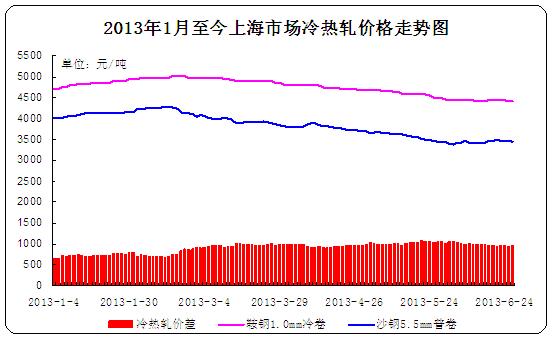 在環(huán)保檢查及城鎮(zhèn)化預(yù)期炒作下,上周鋼坯及進口礦價相繼走高,期螺總體維持震蕩偏強格局,頻頻觸及3500上方,線螺及熱軋卷板等鋼材品種價格也一度出現(xiàn)回升勢頭。本周在銀行“錢荒”事件的愈演愈烈的情勢之下,周初時分A股暴跌,稍有回升的國內(nèi)鋼材市場再次受挫,鋼坯價格率先回調(diào),熱卷價格也有走弱跡象。這也從一定程度上顯示了在供需基本面沒有得到改善的情況下,國內(nèi)鋼材市場這條“咸魚”翻身之后還是難改“咸魚”特質(zhì)。近期冷軋板卷市場表現(xiàn)難不盡如人意,更是成為上周唯一下跌的品種,上海及天津等地報價均有明顯回落。一方面在于季節(jié)性需求低點的原因,另一方面則是冷熱軋價差懸殊過千元,冷軋補跌需求強烈。隨著天氣漸熱,下游需求將會進入淡季,市場仍缺乏剛性需求支撐,加之消息面利空云集,冷軋板卷價格仍有滑落空間。