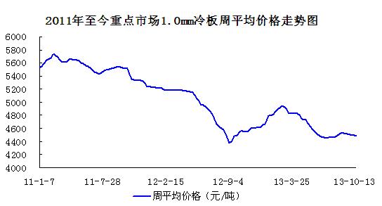 圖一:2011年至今重點(diǎn)市場(chǎng)1.0mm冷板周平均價(jià)格走勢(shì)圖