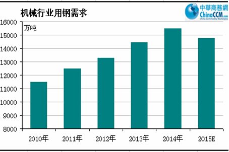 預(yù)計2015年全年機(jī)械行業(yè)主營業(yè)務(wù)收入將保持10%的增長,出口增長8%左右,占比較大的汽車和電工電器行業(yè)仍是主要支撐。2014年機(jī)械行業(yè)用鋼量約為15480萬噸,預(yù)計2015年機(jī)械行業(yè)用鋼量為14775萬噸,同比回落4.55%。