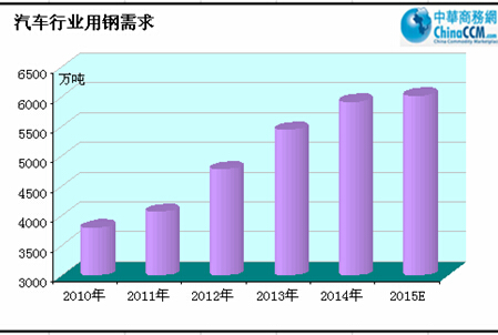 預(yù)計2015汽車行業(yè)后期保持小幅增長,產(chǎn)銷增速繼續(xù)高于機(jī)械其他子行業(yè)、低于去年同期水平,輕量化和節(jié)能環(huán)保是轉(zhuǎn)型升級趨勢。2014年汽車行業(yè)用鋼量約為5915萬噸,預(yù)計2015年汽車行業(yè)用鋼量為6017萬噸,同比增長1.73%。