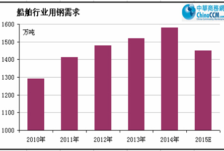 預(yù)計2015年全年成交量將呈前高后低走勢,總額1.1億載重噸左右,年底手持訂單保持在1.3億載重噸左右。船用鋼材消耗量將比2013年有小幅增長,造船用鋼需求預(yù)計約為1300萬噸,其中造船板需求為1000萬噸左右。中長期看,我國未來幾年的造船完工量和開工船量將保持在4500~5000萬載重噸左右,因此造船用鋼消耗在1300~1400萬噸的低位運(yùn)行將保持常態(tài)。后期造船行業(yè)企業(yè)充分發(fā)揮自身科技研發(fā)、制造優(yōu)勢,不斷向海工、非船裝備領(lǐng)域拓展,在能源、交通運(yùn)輸、電子信息、特種裝備等領(lǐng)域形成了一批優(yōu)勢企業(yè);重點(diǎn)造船企業(yè)強(qiáng)化市場需求引導(dǎo),大力發(fā)展綠色環(huán)保船舶、高技術(shù)高附加值船舶、專用特種船舶和高端海洋工程裝備。