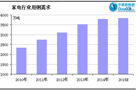 大家電將進(jìn)入以更新消費(fèi)為主的階段;“十三五”期間生產(chǎn)規(guī)模趨于穩(wěn)定;產(chǎn)品結(jié)構(gòu)升級,高端產(chǎn)品仍然是未來的主要趨勢。2014年家電行業(yè)用鋼量約為3790萬噸,預(yù)計2015年家電行業(yè)用鋼量為3842萬噸,家電用鋼增速同比增長1.37%。