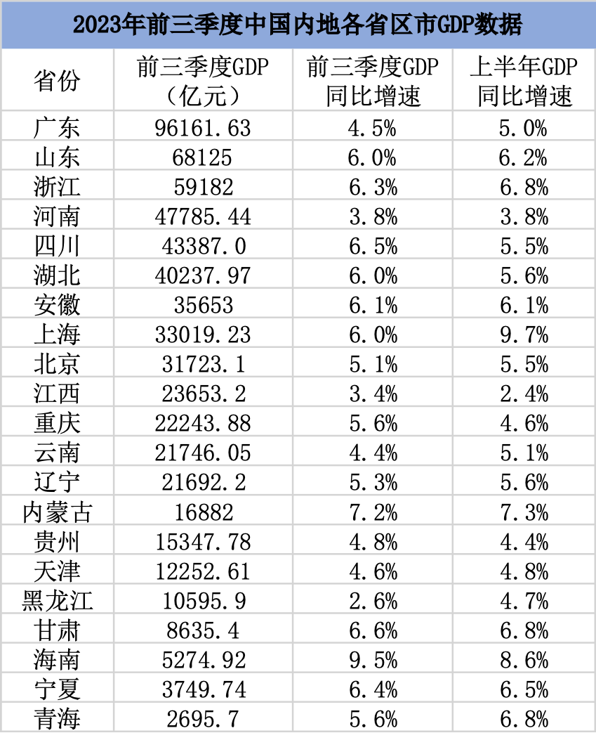 2023年前三季度中國內地各省區(qū)市GDP數(shù)據(jù)表來源:澎湃新聞、各地統(tǒng)計局
