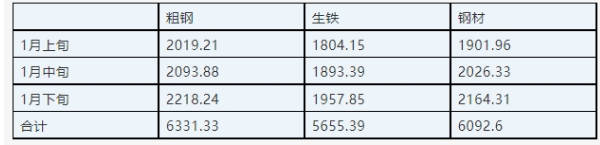 中國鋼鐵工業(yè)協(xié)會統(tǒng)計數(shù)據(jù)顯示,重點統(tǒng)計鋼鐵企業(yè)2024年1月上旬共生產(chǎn)粗鋼2019.21萬噸、生鐵1804.15萬噸、鋼材1901.96萬噸;1月中旬共生產(chǎn)粗鋼2093.88萬噸、生鐵1893.39萬噸、鋼材2026.33萬噸;1月下旬共生產(chǎn)粗鋼2218.24萬噸、生鐵1957.85萬噸、鋼材2164.31萬噸。根據(jù)以上數(shù)據(jù),中鋼協(xié)重點統(tǒng)計鋼鐵企業(yè)1月粗鋼產(chǎn)量累計6331.33萬噸,生鐵產(chǎn)量5655.39萬噸,鋼材產(chǎn)量6092.6萬噸。重點統(tǒng)計鋼鐵企業(yè)產(chǎn)量如下:
