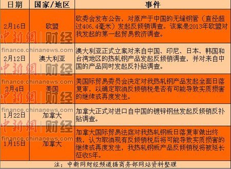 中新網(wǎng)財(cái)經(jīng)頻道發(fā)現(xiàn),進(jìn)入2013年不足2月的時(shí)間里,歐盟、美國(guó)、澳大利亞等國(guó)對(duì)中國(guó)鋼材產(chǎn)品發(fā)起5起反傾銷(xiāo)調(diào)查或終裁。反傾銷(xiāo)調(diào)查頻現(xiàn),鋼鐵行業(yè)外貿(mào)渠道或被進(jìn)一步壓縮,將面臨更為嚴(yán)峻地挑戰(zhàn)。
