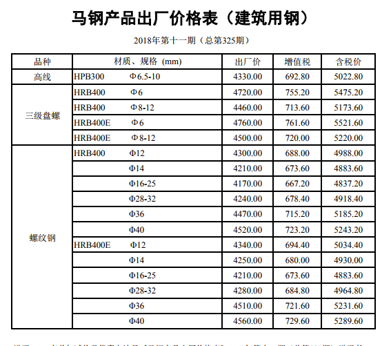 馬鋼鋼廠12月上旬建筑用鋼出廠價格表