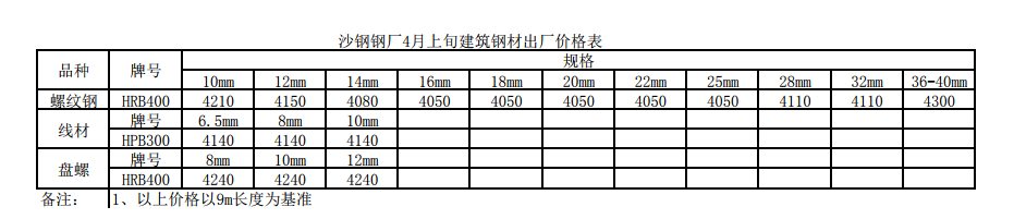 2019年沙鋼鋼廠4月上旬建筑鋼材出廠價(jià)格表執(zhí)行