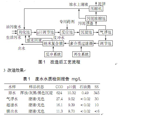 將均化池內(nèi)儲存的經(jīng)過簡單處理的油污廢水輸入反應(yīng)池,控制廢水pH值在10左右,在攪拌的條件下加入專用氧化劑和絮凝劑。通過氧化劑的氧化作用和絮凝劑的捕捉、聚合團聚、架橋等作用,將水中的雜質(zhì)在很短的時間內(nèi)凝聚成比較大的絮狀沉淀。將已經(jīng)形成絮狀沉淀的廢水以一定流速輸入沉淀池,在沉淀池中充分沉淀。絮凝沉淀后的廢水上清液呈無色透明狀。底部沉淀物通過污泥泵提升后輸入污泥池進行集中處理。經(jīng)過絮凝沉淀后的廢水COD降低約50%左右。絮凝沉淀后的上清液中仍然含有部分SS和很細小的乳化油,通過氣浮處理將水中剩余的油類和SS進一步去除。氣浮后的廢水進入調(diào)節(jié)池調(diào)節(jié)pH值,使其pH值在6.0~7.5,以達到后續(xù)膜處理的要求,同時起到儲存、緩沖作用。調(diào)節(jié)好pH值的廢水進入多介質(zhì)過濾器,去除水中的懸浮雜質(zhì)和重金屬離子,保證進入納米材料復(fù)合膜的水的水質(zhì)達到進膜要求。經(jīng)過多介質(zhì)過濾器處理后的廢水,再通過特殊設(shè)計的包括保安過濾器和超濾裝置的納米材料復(fù)合膜裝置進行處理,使出水水質(zhì)達到國家一級排放標(biāo)準(zhǔn)和回用要求。改造后工藝流程如圖1所示。