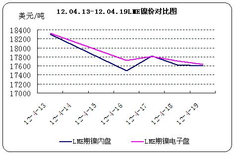 周四,倫敦基本金屬窄幅震蕩,倫銅小幅收漲,倫鎳承壓回落。LME期鎳內(nèi)盤17600美元/噸,較上周五-705美元/噸。期鎳電子盤收盤17636美元/噸,較上周五-690美元/噸。周一,歐債危機持續(xù),憂慮全球經(jīng)濟,LME期鎳內(nèi)盤17500美元/噸收盤。周三,期待消息面變化,期鎳盤中震蕩收跌,LME期鎳內(nèi)盤17630美元/噸收盤。繼續(xù)期待消息變化,期鎳依然疲弱震蕩。連續(xù)幾日來,多數(shù)基本金屬走勢徘徊,期鎳更是疲弱盤整。