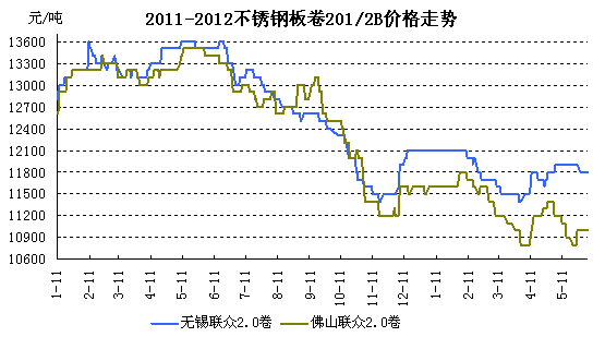 國(guó)內(nèi)300系不銹鋼價(jià)格五月總體處于向下盤整的態(tài)勢(shì)。由于受原材料期鎳價(jià)格的影響,部分地區(qū)下跌幅度較大。無錫市場(chǎng)張浦304/2B平板價(jià)格從月初18000元/噸到月末17100元/噸,累積走跌900元/噸。佛山市場(chǎng)上張浦304/2B冷軋卷板從月初18800元/噸至18500元/噸,總體出現(xiàn)500元/噸跌幅。由此可見,本月300系不銹鋼產(chǎn)品普遍走低,跌幅較大。