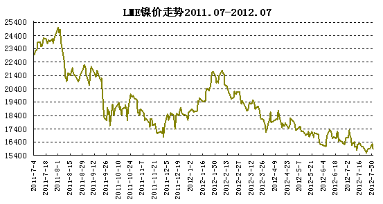 走勢圖中7月份期鎳總體維持下浮走勢。與6月份低位相比,目前期鎳價格已經(jīng)再降一層階梯,從16000美元/噸防線跌落至15500美元/噸上下?傮w形勢不容樂觀。同期比較,上月末收盤價為16730美元/噸,截止本月末,期鎳跌幅近千美元/噸,而其中低位水平接近15500美元/噸。