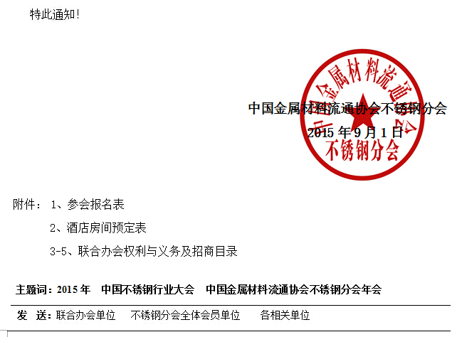 一、會(huì)議名稱:2015中國不銹鋼行業(yè)大會(huì)暨中國金屬材料流通協(xié)會(huì)不銹鋼分會(huì)會(huì)員代表大會(huì)