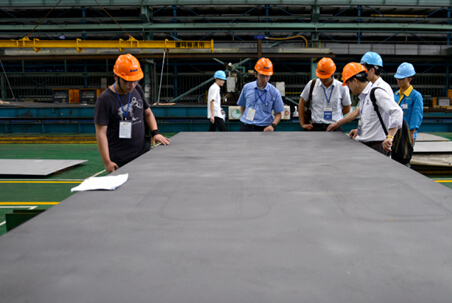 圖三、寶鋼業(yè)務(wù)人員、用戶代表在大明加工中心檢查9Ni厚板加工質(zhì)量