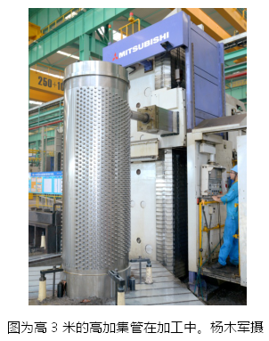 江蘇省靖江基地大明重工有限公司首次承接加工電站設備客戶配套件-高壓加熱器集管,3米高的高加集管也首次進行國產(chǎn)化生產(chǎn)。該高壓加熱器集管是電站回熱系統(tǒng)的重要設備,高加管板、換熱管、殼體構成其主體部件。為解決高加管板經(jīng)常性發(fā)生滲漏、隔離困難、檢修時間長等問題,客戶通過攻關設計,開發(fā)了集管來代替高加管板。大明重工應用意大利pama、三菱落地鏜等對6套高加集管進行同步加工,并對車、銑、鉆孔加工的質(zhì)量層層控制,加工質(zhì)量獲得客戶的高度認可。(楊木軍攝)