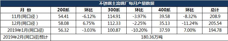 2019年1月份主流21家鋼廠同口徑不銹鋼粗鋼產(chǎn)量總量為194.78萬(wàn)噸,環(huán)比減少5.23。分系別來(lái)看,200系產(chǎn)量56.32萬(wàn)噸,環(huán)比減3.03%,主要因鞍鋼聯(lián)眾減產(chǎn)、北海誠(chéng)德略轉(zhuǎn)300系導(dǎo)致,但需注意寶鋼德盛1月復(fù)產(chǎn),200系產(chǎn)量2.32萬(wàn)噸;300系產(chǎn)量環(huán)比減幅最大為10.20%,主要因青山系,福建青拓、廣青科技均有檢修、減產(chǎn)措施,環(huán)比2018年12月一共減300系超15萬(wàn)噸;400系環(huán)比增加7.00%,泰山鋼鐵結(jié)束檢修,產(chǎn)量恢復(fù);但鞍鋼聯(lián)眾本月產(chǎn)量略減,綜合總量環(huán)比仍略有增加。2019年2月份同口徑預(yù)計(jì)總產(chǎn)量180.36萬(wàn)噸,200系51.06萬(wàn)噸,300系91.6萬(wàn)噸,400系37.82萬(wàn)噸,2月春節(jié)前后鋼廠集中檢修、減產(chǎn)。