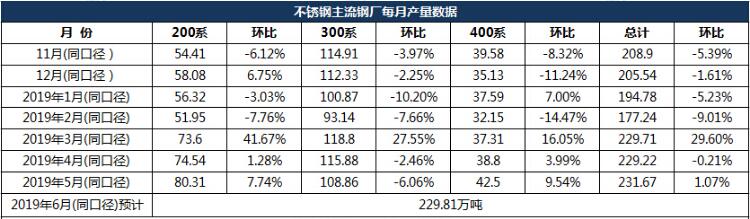 2019年5月份主流21家鋼廠同口徑不銹鋼粗鋼產(chǎn)量總量為231.67萬噸,環(huán)比4月微幅增加1.07%。分系別來看,200系產(chǎn)量80.31萬噸,環(huán)比增加7.74%,主要因廣青繼續(xù)300系產(chǎn)量轉(zhuǎn)200系,其200系產(chǎn)量環(huán)比增5萬噸左右,另北海誠德200系小幅增加,其余廠家200系量變化不大;300系產(chǎn)量108.86萬噸,環(huán)比減少6.06%,主要因青山集團部分300系量轉(zhuǎn)200系,聯(lián)眾300系量也有小幅減少,其余廠家環(huán)比變化不大;400系42.5萬噸,環(huán)比增加9.54%,主要太鋼、福欣特鋼400系產(chǎn)量環(huán)比增加。2019年6月份同口徑預計總產(chǎn)量229.81萬噸,200系80.2萬噸,300系110.26萬噸,400系39.35萬噸,6月繼續(xù)維持高排產(chǎn)。