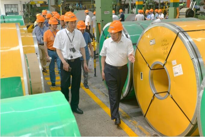 圖一、康力電梯董事長王友林(前二)與大明國際總裁蔣長虹(前一),在參觀不銹鋼加工中心。(楊木軍攝)