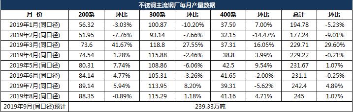 2019年8月份主流21家鋼廠(chǎng)同口徑不銹鋼粗鋼產(chǎn)量總量為245萬(wàn)噸,環(huán)比7月增加1.07%。分系別來(lái)看,200系產(chǎn)量88.35萬(wàn)噸,環(huán)比減少0.89%,主要因鞍鋼聯(lián)眾和金匯減產(chǎn);300系產(chǎn)量115.29萬(wàn)噸,環(huán)比增加1.18%,主要因福欣特鋼400系轉(zhuǎn)產(chǎn)300系,產(chǎn)量增加約2萬(wàn)噸;400系41.16萬(wàn)噸,環(huán)比增加4.71%,主要是太鋼集團(tuán)300系轉(zhuǎn)產(chǎn)400系,增加400系3萬(wàn)噸,另外福欣減少約1.3萬(wàn)噸,其余鋼廠(chǎng)各有增減。2019年9月份同口徑預(yù)計(jì)總產(chǎn)量239.33萬(wàn)噸,200系84.4萬(wàn)噸,300系113.48萬(wàn)噸,400系41.15萬(wàn)噸,,9月產(chǎn)量略有減少,但整體繼續(xù)維持高排產(chǎn)。